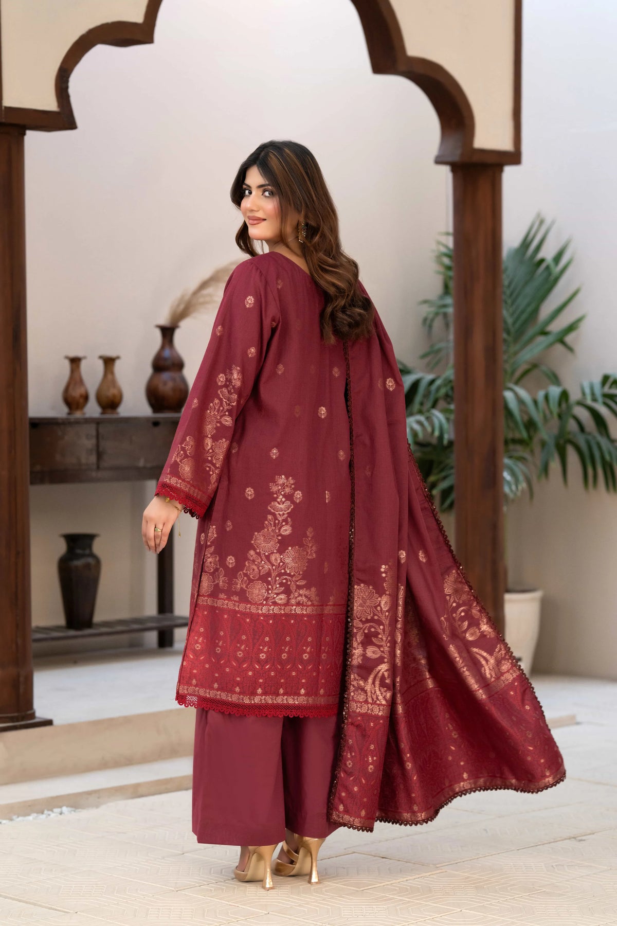 3 Pc Unstitched Premium Jacquard Lawn Maroon Suit