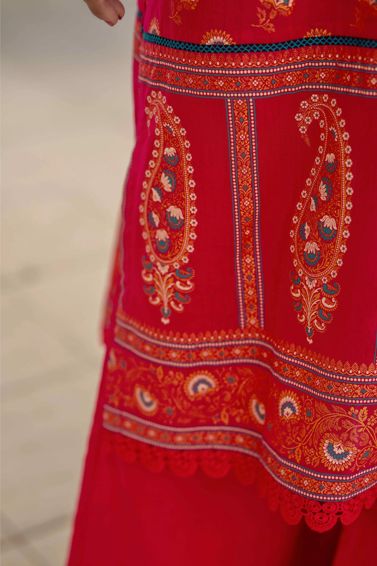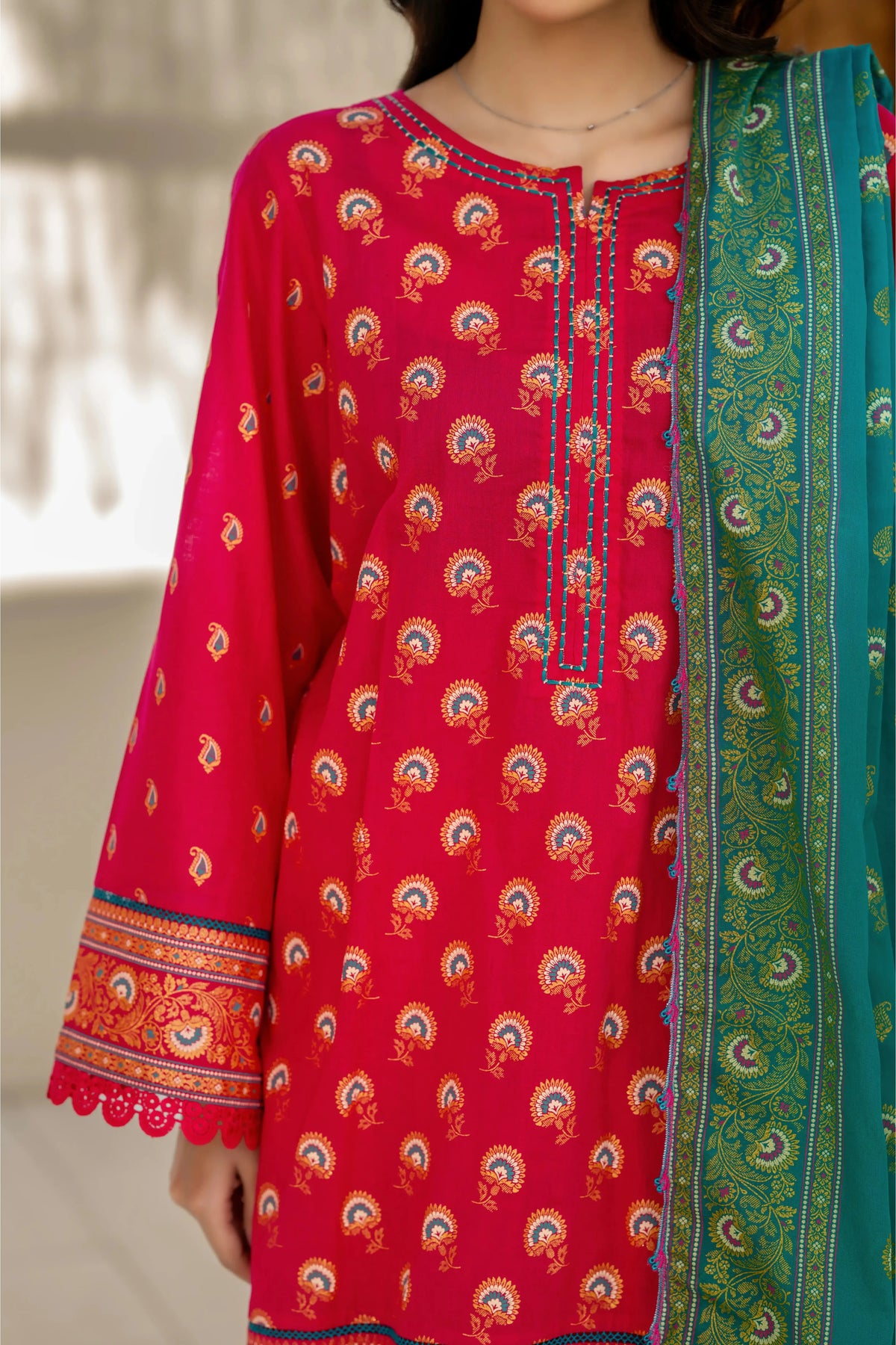 Red Printed Suit with Green Contrast Dupatta – 3 Piece
